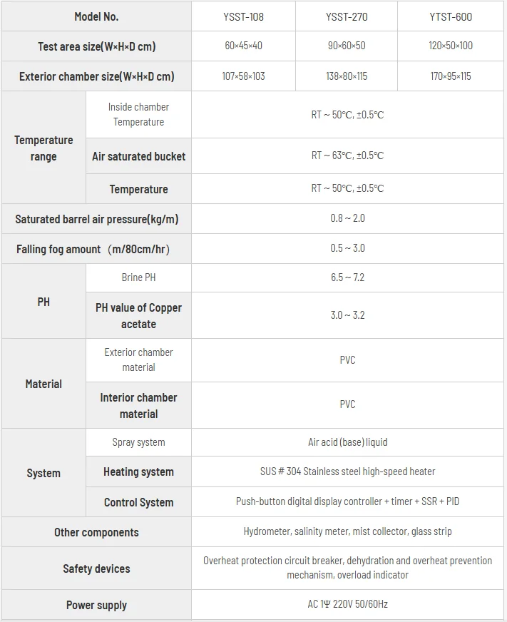 - Complies with ASTM B-117, B-287, JIS D0205, H-8681, Z-2771, K-5400 standards, etc.